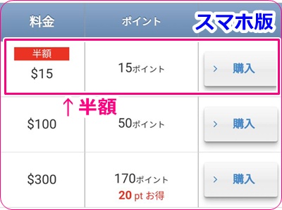 | 15ドル※スマホのみ | 15ポイント | 1ドル/1ポイント |
