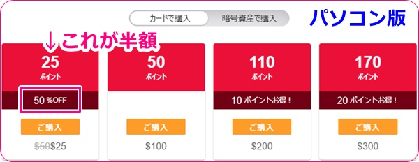 スマホ版とパソコン版でどちらでポイントを購入するかでも内容が少し変わりますが、一回だけ半額で購入できるプランがあります。