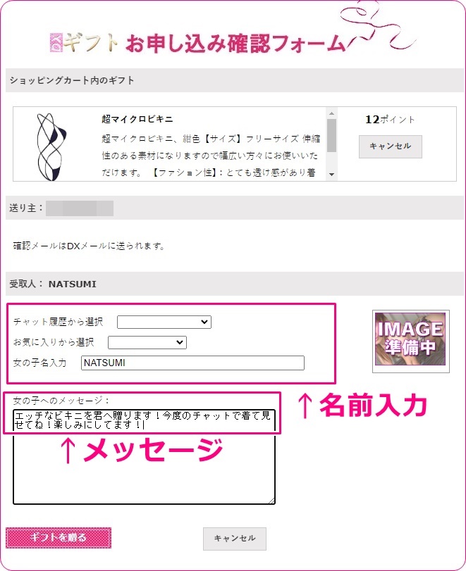 あとは女の子の名前を入力して、女の子へのメッセージも入力したら『ギフトを贈る』のボタンを押せばDXギフト注文完了です。