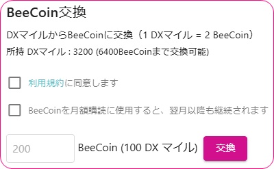 DXLIVEで200マイル以上持っているとBeeCoin購入画面でマイル交換の選択も表示されます。