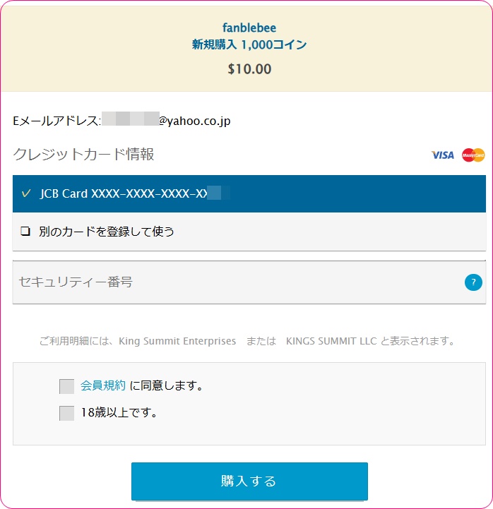 会員規約の同意と年齢認証にチェックを入れてから『購入する』をクリックすればBeecoinの購入は完了です。
