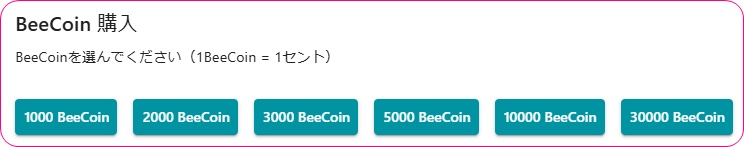 どれだけ購入するかの選択が出来ます。1BeeCoinは1円で購入出来ます。まとめて購入をしても単価は変わりませんので、無理のない分だけ購入しましょう。