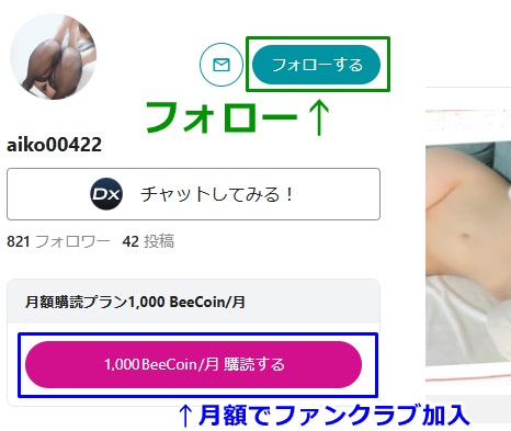 フォローとファンクラブ加入のボタンは写真の左側に表示されています。