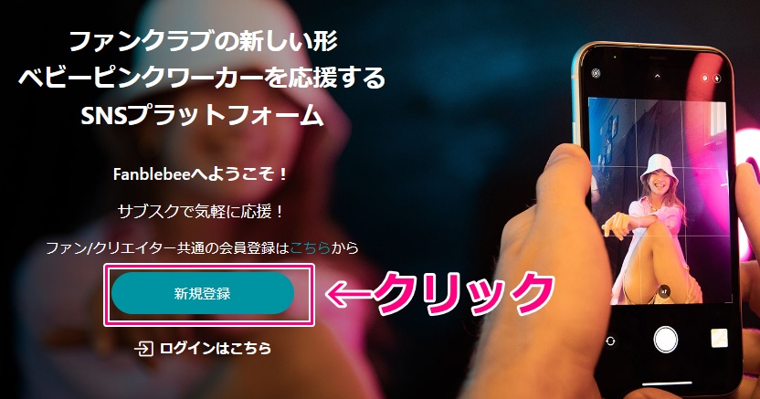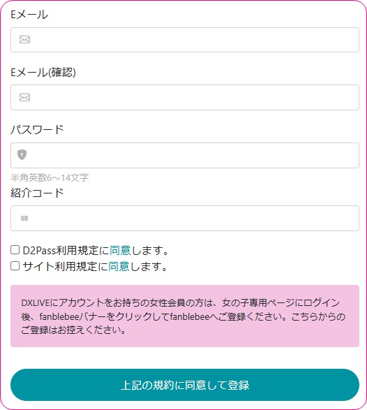 DXLIVEのアカウント情報でfanblebeeにもログインできるので、あえて新規登録をする必要はありません。しかし、DXLIVEに入会登録をしていない状態でfanblebeeだけ使いたいという場合には登録が必要ですので、念のために入会登録方法を解説していきます。