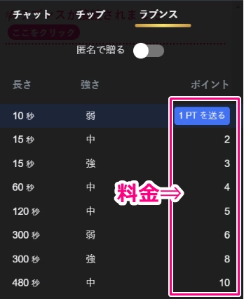 ラブンスの料金は1〜10ポイントとなっていて、チップを多く支払うほどラブンスが振動する時間が長くなったり、振動の強さが強力になっていきます。